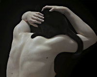 ︎︎︎Lit by a mystical spotlight, white bodies are found half-asleep in dramatic poses, as if they were battling with the minds trying to control them in a way that reminds the “Dying Slave” (1513-1516) by Michelangelo. Black cats, which may be real or not, intertwine with the flesh of the models, becoming a companion that brings uncomfortableness and disquietude.